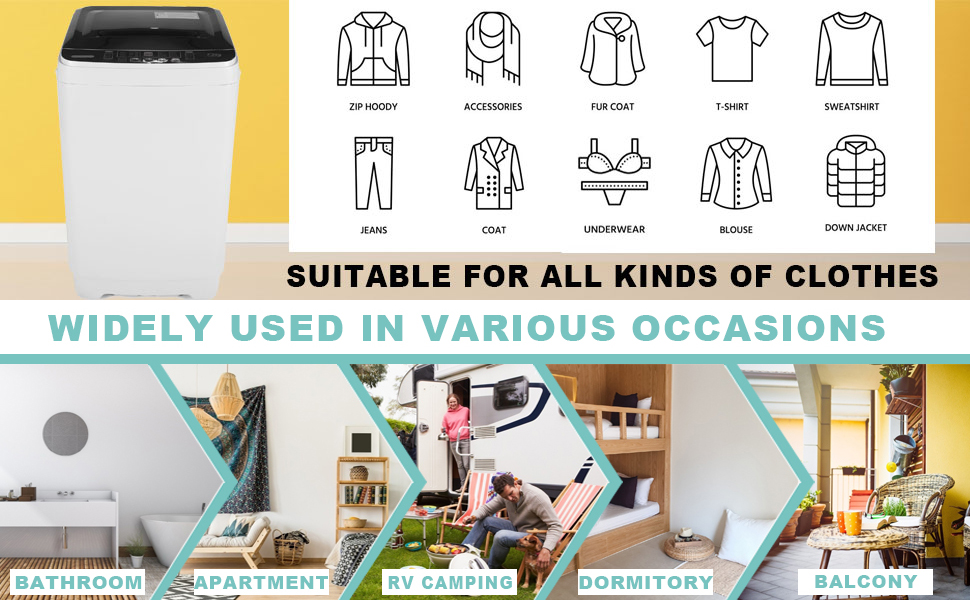【Compact Design & Large Load Capacity】Comes with spacious capacity, powerful motor and drain pump, this washer machine is compact and lightweight for you to easily move it in your home. No installation and easy operation.The transparent lid allows you to view and monitor the water and washing conditions.The honeycomb shaped inner tub can load 17.8lbs at one time and wash many clothes for you. Suitable for dorms, apartment, condos, RV's, camping and more.